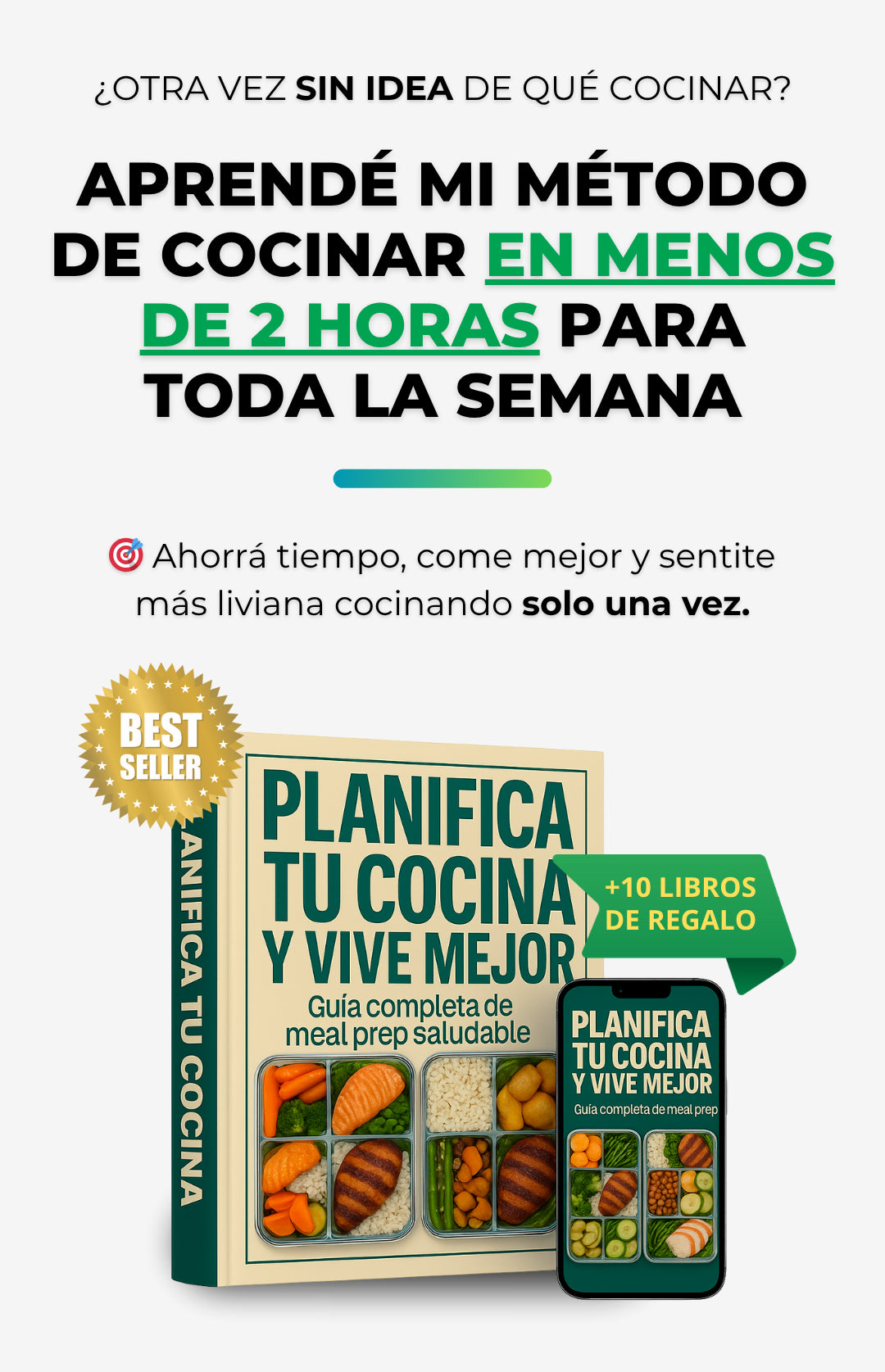 Vas a recibir un ebook digital en formato PDF, que llega directo a tu correo apenas confirmás el pago. Incluye un método paso a paso para cocinar en menos de 3 horas y resolver todas tus comidas de la semana, con recetas saludables sin azúcar ni harinas refinadas. Además, vas a recibir 10 bonus digitales gratis con menús completos, guías de conservación, recetas dulces, saladas y más.